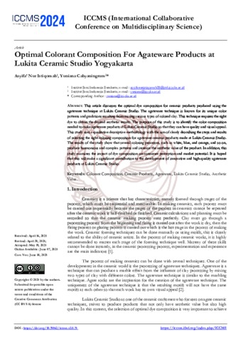 Istiqomah, Asyifa Nur and Cahyaningrum, Yuniana (2025) Optimal Colorant Composition For Agateware Products at Lukita Ceramic Studio Yogyakarta. ICCMS (International Collaborative Conference On Multidisciplinary Science), 6 (1). pp. 1-11. ISSN 979-8-4007-1721-5