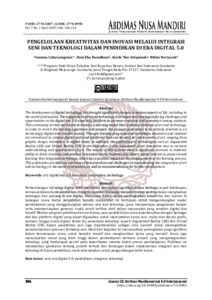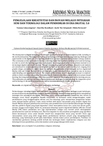 Cahyaningrum, Yuniana and Ramdhani, Dani Eka and Istiqomah, Asyifa’ Nur and Noviyanti, Nikita (2025) PENGELOLAAN KREATIVITAS DAN INOVASI MELALUI INTEGRASI SENI DAN TEKNOLOGI DALAM PENDIDIKAN DI ERA DIGITAL 5.0. Jurnal Abdimas Nusa Mandiri, 7 (1). pp. 1-9. ISSN 2774-5007