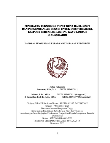 Sumarno, Sumarno (2022) PENERAPAN TEKNOLOGI TEPAT GUNA HASIL RISET DAN PENGEMBANGAN DESAIN UNTUK INDUSTRI MEBEL EKSPORT BERBAHAN RANTING KAYU LIMBAH DI SUKOHARJO LAPORAN PENGABDIAN KEPADA MASYARAKAT KELOMPOK. Other. ISI Surakarta, FSRD ISI Surakarta. (Unpublished)