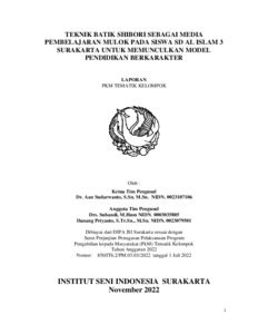 Kegiatan PKM dengan judul “Teknik Batik Shibori Sebagai Media Pembelajaran Mulok pada Siswa SD Al Islam 3 Surakarta untuk Memunculkan Model Pendidikan Berkarakter” ini merupakan kegiatan pengabdian kepada masyarakat yang bertujuan untuk meningkatkan pengetahuan tentang seni budaya pada anak usia Sekolah Dasar. Pemikiran ini didasari oleh pentingnya mulok dengan seni budaya sebagai basis model pendidikan berkarakter. Salah satunya seni budaya yang tumbuh dan berkembang adalah batik shibori. Pemberian materi batik shibori penting karena, materi ini bersifat lokal yang berakar dari budaya yang ada di Surakarta. Diharapkan dapat menguatkan siswa agar tidak terkikis oleh perkembangan budaya-budaya baru yang hadir di lingkungan siswa. Pemberian materi lokal sebagai bagian pendidikan yang berkarakter berupa pembelajaran batik shibori diperkenalkan pada anak SD Al Islam 3 Gebang Surakarta. Pemilihan wilayah mitra di Surakarta penting karena merupakan wilayah yang menjadi pusat batik, berkaitan dengan kesinambungan dan pelestarian ke depan. Berpijak dari kegiatan awal diketahui, terdapat beberapa permasalahan yang menjadi kendala dan terjadi pada mitra PKM ini, antara lain : Masih minimnya pengetahuan siswa mengenai batik shibori. Selain itu, adanya kendala minimnya media ajar yang berbasis pada seni. Selanjutnya, masih kurangnya strategi pembelajaran muatan lokal sebagai basis pengetahuan yang perlu dikembangkan kususnya di tingkat Sekolah Dasar. Berpijak dari permasalahan tersebut maka tim PKM ISI Surakarta melakukan kegiatan PKM Tematik Kelompok, dengan target mitra SD Al Islam 3 Gebang Surakarta. Fokus dari kegiatan PKM ini lebih diarahkan pada pada aspek peningkatan kualitas pembelajaran pada model pendidikan berkarakter. Dengan dilakukan beberapa pendekatan seperti pendidikan, pelatihan dan pendampingan. Kemudian dilakukan penguatan sumber daya manusia dan pemanfaatan teknologi tepat guna, yang diharapkan dapat meningkatkan soft skill siswa.