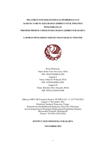 Laras, Ketut Gura Arta (2022) PELATIHAN FOTOGRAFI SEBAGAI PEMBERDAYAAN KARANG TARUNA KELURAHAN JEBRES UNTUK STRATEGI PENGEMBANGAN PROMOSI PRODUK UMKM DI KELURAHAN JEBRES SURAKARTA. Project Report. Fakultas Seni Rupa dan Desain, Fakultas Seni Rupa dan Desain. (Unpublished)