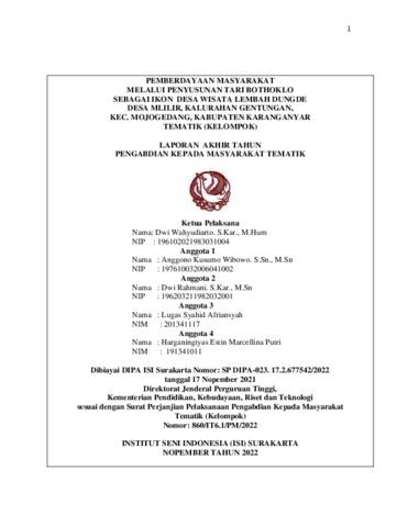 Pengabdian Kepada Masyarakat Tematik (Kelompok), dengan Judul "Pemberdayaan Masyarakat Melalui Penyusunan Tari Bothoklo Sebagai Ikon Desa Wisata Lembah Dungde Desa Mlilir, Kalurahan Gentungan, Kec. Mojogedang, Kabupaten Karanganyar" merupakan program pendampingan kepada masyarakat sebagai wujud nyata dari implementasi Visi Institut Seni Indonesia Surakarta. PKM ini merupakan pemberdayaan masyarakat dengan pendampingan menyusun tari Bothoklo yang akan digunakan sebagai icon desa wisata Lembah Dungde. Proses penyusunan dilakukan bersama masyarakat, hal ini sebagai bentuk edukasi cipta kreatif agar masyarakat terbangun jiwa krasinya. Metode yang digunakan dalam penyusunan tari Bothoklo adalah metode tiga R, yaitu Re-visiting, Re- Questioning dan Re- Interpreting. Hasil penyusunan Tari Bothoklo kemudian dilatihkan kepada masyarakat sebagai penguatan daya tarik wisatawan. Pelaksanaan pelatihan dilaksanakan di Desa Wisata Lembah Dungde, Desa Mlilir, Kalurahan Gentungan, Hal ini dimaksudkan dapat lebih mendekatkan dan lebih mengenalkan kampus Institut Seni Indonesia Surakarta di masyarakat. Selain itu, bentuk pelatihan bersama masyarakat juga dapat sebagai daya tarik masyarakat / wisatawan yang datang di Lembah Dungde. Hasil PKM adalah tersusunnya Tari Bothoklo yang bersumber dari budaya tradisi masyarakat Desa Mlilir. Dikemas dalam bentuk kelompok akan tetapi pengembangannya bisa digunakan untuk tari massal. Musik yang digunakan adalah ragam etnik di daerah Mlilir, dan busana menggunakan artistik batang mendong, kemasan kini. Hasil pelatihan program PKM betul-betul dirasakan masyarakat, karena memiliki kemampuan sebagai penari, tarian yang telah dikuasai dapat dipentaskan setiap saat di Desa Wisata Lembah Dungde sebagai daya tarik dan ikon desa wisata.