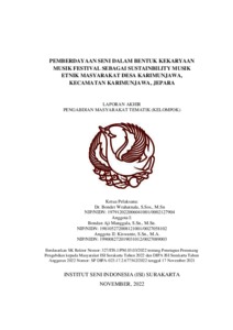 Wrahatnala, Bondet (2022) PEMBERDAYAAN SENI DALAM BENTUK KEKARYAAN MUSIK FESTIVAL SEBAGAI SUSTAINBILITY MUSIK ETNIK MASYARAKAT DESA KARIMUNJAWA, KECAMATAN KARIMUNJAWA, JEPARA LAPORAN AKHIR PENGABDIAN MASYARAKAT TEMATIK (KELOMPOK). Project Report. ISI Surakarta, FSP ISI Surakarta. (Unpublished)