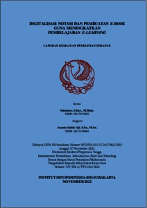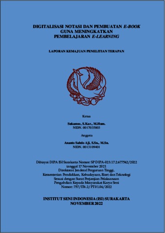 Sukamso, Sukamso (2022) DIGITALISASI NOTASI DAN PEMBUATAN E-BOOK GUNA MENINGKATKAN PEMBELAJARAN E-LEARNING. Project Report. ISI Surakarta, SURAKARTA. (Unpublished)