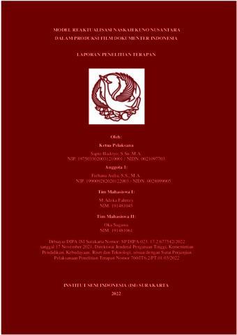 Hudoyo, Sapto (2022) MODEL REAKTUALISASI NASKAH KUNO NUSANTARA DALAM PRODUKSI FILM DOKUMENTER INDONESIA. Project Report. ISI Surakarta, SURAKARTA. (Unpublished)