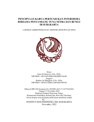 Kuncoro, Jonet Sri (2022) PENCIPTAAN KARYA PERTUNJUKAN INTERMEDIA BERSAMA PENYANDANG TUNA NETRA DAN RUNGU DI SURAKARTA. Project Report. ISI Surakarta. (Unpublished)