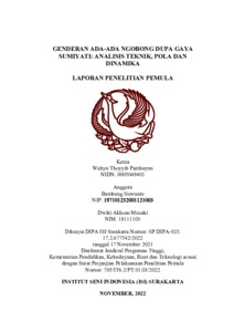 Pambayun, Wahyu Thoyyib and Siswanto, Bambang and Muzaki, Dwiki Akhsan (2022) GENDERAN ADA-ADA NGOBONG DUPA GAYA SUMIYATI: ANALISIS TEKNIK, POLA DAN DINAMIKA. Project Report. Institut Seni Indonesia Surakarta, Surakarta. (Unpublished)