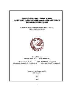 Sumarno, Sumarno (2023) HOME WARE BAHAN LIMBAH JERAMI HASIL RISET UNTUK MEMBERDAYAKAN IBU-IBU PETANI DI KABUPATEN BOYOLALI. Project Report. Fakultas Seni Rupa dan Desain, Fakultas Seni Rupa dan Desain. (Unpublished)