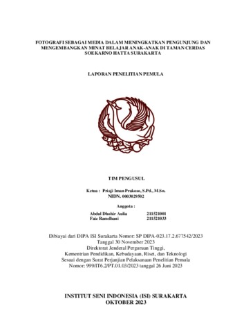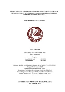 Prakoso, Priaji Iman and Aulia, Abdul Dhohir and Ramdhani, Faiz (2025) FOTOGRAFI SEBAGAI MEDIA DALAM MENINGKATKAN PENGUNJUNG DAN MENGEMBANGKAN MINAT BELAJAR ANAK-ANAK DI TAMAN CERDAS SOEKARNO HATTA SURAKARTA. Project Report. Institut Seni Indonesia Surakarta, Surakarta. (Unpublished)