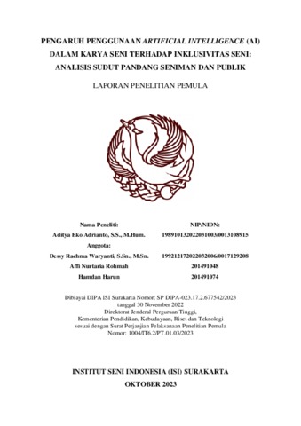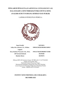 Adrianto, Aditya Eko and Waryanti, Dessy Rachma and Rohmah, Affi Nurtaria and Harun, Hamdan (2023) PENGARUH PENGGUNAAN ARTIFICIAL INTELLIGENCE (AI) DALAM KARYA SENI TERHADAP INKLUSIVITAS SENI: ANALISIS SUDUT PANDANG SENIMAN DAN PUBLIK. Project Report. Institut Seni Indonesia Surakarta, Surakarta. (Unpublished)