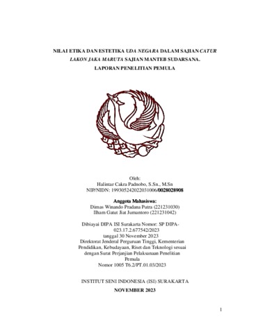 Padnobo, Halintar Cokro and Putra, Dimas Winando Pradana and Jumantoro, Ilham Gatut Jiat (2023) NILAI ETIKA DAN ESTETIKA UDA NEGARA DALAM SAJIAN CATUR LAKON JAKA MARUTA SAJIAN MANTEB SUDARSANA. Project Report. Institut Seni Indonesia Surakarta, Surakarta. (Unpublished)