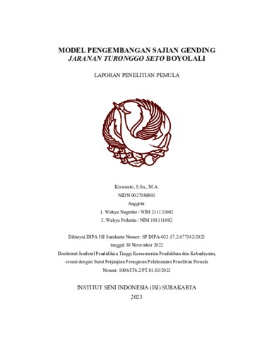 Penelitian yang berjudul “Model Pengembangan Sajian Gending Jaranan Turonggo Seto Boyolali” ini bertujuan untuk mengkonseptualisasikan dan memformulasikan karakteristik bentuk pola yang merepresentasikan mengenai bangunan sistem musikal gending jaranan, metode (tahapan dan strategi) pengembangannya, serta hasil karya dari pengembangan itu sendiri. Penelitian ini secara teoritik mengandung dimensi konseptual yang dapat diterapkan secara praktis untuk tahapan serta metode pengembangan bentuk sajian gending jaranan, serta diadopsi dan diadaptasikan untuk kegiatan kreativitas seni dan pengembangan seni pertunjukan yang lainnya. Penelitian dilakukan melalui pendekatan etnografi yang berlatar kegiatan partisipatif dan kolaboratif sebagai dasar pengalaman terlibat untuk pembentukan pengetahuan. Penelitian dilakukan dalam setting (pengaturan) yang natural untuk berinteraksi secara dialogis dan dialektis bersama masyarakat dalam rangka menggali informasi lebih jauh berdasarkan native point of view, dengan didukung teknik pengumpulan data melalui aktivitas pengamatan, wawancara, dokumentasi, dan studi pustaka. Penelitian ini menghasilkan temuan berupa model pengembangan sajian gending jaranan Turonggo Seto Boyolali yang mengacu pada aspek penataan dan penggarapan sajian gending (musik). Sajian gending jaranan Turonggo Seto Boyolali memiliki pola dasar dengan susunan yang dirangkai berdasarkan susunan rangkaian gerak tari dari awal hingga akhir yang terdiri dari empat bagian pokok sebagai kerangka dasarnya, yaitu budhalan, sembahan, ngirid, dan lampahan. Metode yang dilakukan dan diterapkan untuk menata dan menggarap ulang gending jaranan hingga memiliki nilai kebaruan pada prinsipnya tetap berpijak pada pola dasar sajian gending yang dirangkai berdasarkan susunan rangkaian gerak tari dari awal hingga akhir, sehingga bersifat saling terikat dan saling terkait yang terintegrasi dengan pengembangan bentuk sajian gerak tari. Bentuk-bentuk gending yang telah digarap dan dikembangkan sebelumnya juga dijadikan sebagai pijakan dasar untuk diubah dan diperbarui melalui menambah dan mengurangi beberapa unsurnya, yaitu untuk menggantikan unsur-unsur yang lama dengan unsur-unsur yang memiliki nilai kebaruan. Pengembangan yang dilakukan juga menunjukkan adanya penambahan varian jenis gending yang jarang atau bahkan tidak dijumpai pada bentuk garap versi sebelumnya, yaitu gending sampak, srepeg, dan ladrang