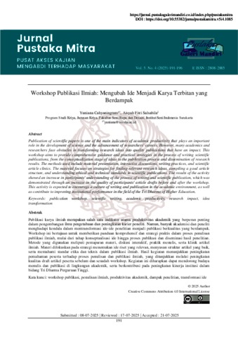 Publication of scientific papers is one of the main indicators of academic productivity that plays an important role in the development of science and the advancement of researchers' careers. However, many academics and researchers face obstacles in transforming research ideas into quality publications that have an impact. This workshop aims to provide comprehensive guidance and practical strategies in the process of writing scientific publications, from the conceptualization stage of ideas to the publication process and dissemination of research results. The methods used include material presentation, interactive discussions, writing practices, and scientific article clinics. The material focuses on strategies for finding relevant research ideas, compiling a good article structure, and understanding ethical and technical standards in scientific publications. The results of the activity showed an increase in participants' understanding of the process of writing and scientific publication, which was demonstrated through an increase in the quality of participants' article drafts before and after the workshop. This activity is expected to encourage a culture of writing and publication in the academic environment, as well as contribute to improving institutional performance in the field of the Tri Dharma of Higher Education.