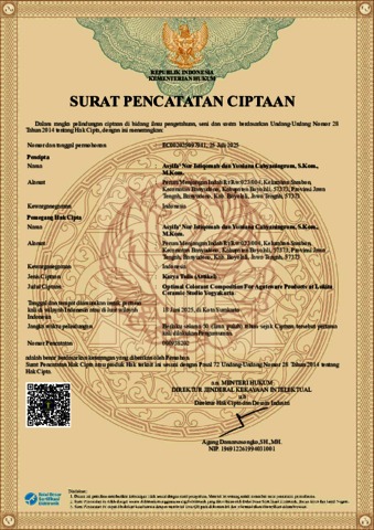 Surat Penciptaan Ciptaan Karya Tulis berjudul Optimal Colorant Composition For Agateware Products at Lukita Ceramic Studio Yogyakarta