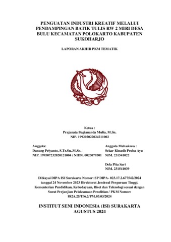Mulia, Prajanata Bagiananda (2024) PENGUATAN INDUSTRI KREATIF MELALUI PENDAMPINGAN BATIK TULIS RW 2 MIRI DESA BULU KECAMATAN POLOKARTO KABUPATEN SUKOHARJO. Project Report. Fakultas Seni Rupa dan Desain, Fakultas Seni Rupa dan Desain. (Unpublished)