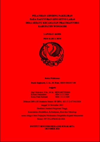 Sugiyanto, Danis and Setiawan, Sigit (2024) PELATIHAN GENDING PAKELIRAN PADA PAGUYUBAN SENI SETYO LARAS DESA SEDAYU KECAMATAN PRACIMANTORO KABUPATEN WONOGIRI. Project Report. Fakultas Seni Pertunjukan ISI Surakarta. (Unpublished)