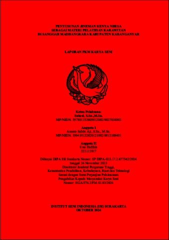 Sukesi, Sukesi and Aji, Ananto Sabdo and Hafifah, Umi (2024) PENYUSUNAN JINEMAN KENYA NDESA SEBAGAI MATERI PELATIHAN KARAWITAN DI SANGGAR MADHANGKARA KABUPATEN KARANGANYAR. Project Report. Fakultas Seni Pertunjukan ISI Surakarta. (Unpublished)