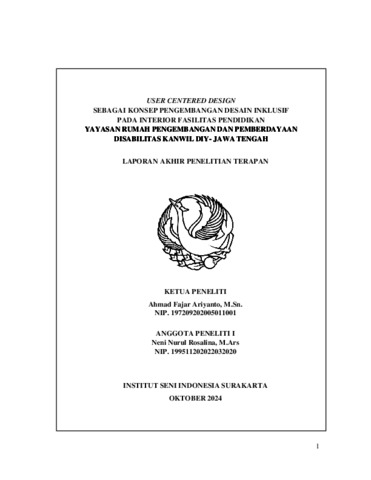 Ariyanto, Ahmad Fajar (2024) USER CENTERED DESIGN SEBAGAI KONSEP PENGEMBANGAN DESAIN INKLUSIF PADA INTERIOR FASILITAS PENDIDIKAN YAYASAN RUMAH PENGEMBANGAN DAN PEMBERDAYAAN DISABILITAS KANWIL DIY- JAWA TENGAH. Project Report. ISI Surakarta, SURAKARTA. (Unpublished)