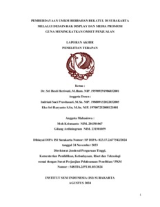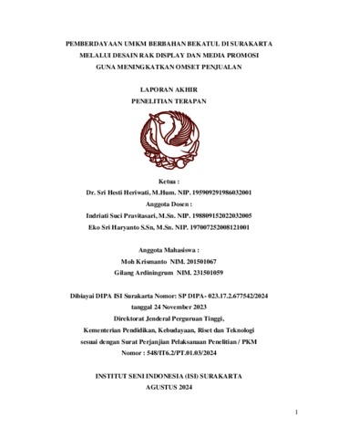 Heriwati, Sri Hesti (2024) PEMBERDAYAAN UMKM BERBAHAN BEKATUL DI SURAKARTA MELALUI DESAIN RAK DISPLAY DAN MEDIA PROMOSI GUNA MENINGKATKAN OMSET PENJUALAN. Project Report. ISI Surakarta, SURAKARTA. (Unpublished)