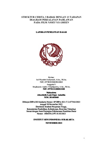 Setiawati, Sri Wastiwi and Triadiputra, Stephanus Andre and Anindita, Jehezkielle Leah Fajar (2023) STRUKTUR CERITA 3 BABAK DENGAN 13 TAHAPAN DIAGRAM PERJALANAN PAHLAWAN PADA FILM NJOET NJA DHIEN. Project Report. ISI Surakarta, Surakarta. (Unpublished)