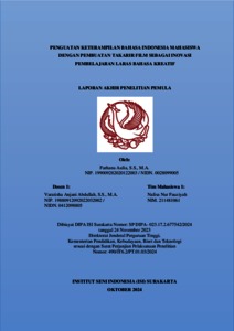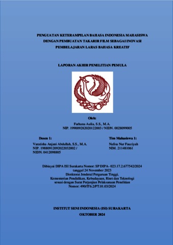 Aulia, Farhana and Abdullah, Varatisha Anjani and Fauziyah, Nafisa Nur (2024) PENGUATAN KETERAMPILAN BAHASA INDONESIA MAHASISWA DENGAN PEMBUATAN TAKARIR FILM SEBAGAI INOVASI PEMBELAJARAN LARAS BAHASA KREATIF. Project Report. Institut Seni Indonesia Surakarta, Surakarta. (Unpublished)