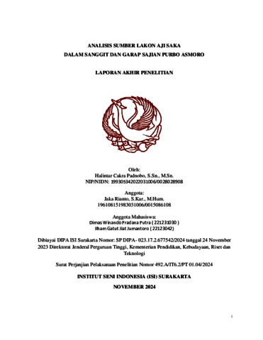 Padnobo, Halintar Cokro and Rianto, Jaka and Putra, Dimas Winando Pradana and Jumantoro, Ilham Gatut Jiat (2024) ANALISIS SUMBER LAKON AJI SAKA DALAM SANGGIT DAN GARAP SAJIAN PURBO ASMORO. Project Report. Institut Seni Indonesia Surakarta, Surakarta. (Unpublished)