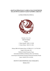 Kiswanto, Kiswanto and Nugroho, Wahyu and Prihatin, Wahyu (2024) ADAPTASI PERANGKAT GAMELAN DAN ELEKTRONIK DALAM PENGGARAPAN SAJIAN GENDING JARANAN. Project Report. Institut Seni Indonesia Surakarta, Surakarta. (Unpublished)