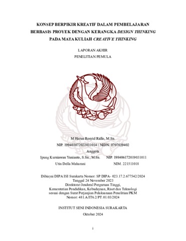 Ridlo, M Harun Rosyid and Yunianto, Ipung Kurniawan and Maharani, Utin Della (2024) KONSEP BERPIKIR KREATIF DALAM PEMBELAJARAN BERBASIS PROYEK DENGAN KERANGKA DESIGN THINKING PADA MATA KULIAH CREATIVE THINKING. Project Report. Institut Seni Indonesia Surakarta, Surakarta. (Unpublished)