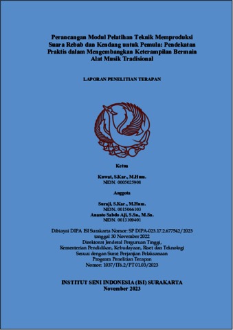 Kuwat, Kuwat (2023) Perancangan Modul Pelatihan Teknik Memproduksi Suara Rebab dan Kendang untuk Pemula: Pendekatan Praktis dalam Mengembangkan Keterampilan Bermain Alat Musik Tradisional. Project Report. ISI SURAKARTA, Surakarta. (Unpublished)