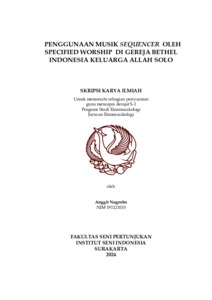 Skripsi dengan judul “Penggunaan Musik Sequencer Oleh Specified Worship Di Gereja Bethel Indonesia Keluarga Allah Solo” merupakan penelitian yang memfokuskan pada persoalan penggunaan musik sequencer dalam ibadah. Penelitian ini pada dasarnya bertujuan untuk mengungkap hal yang mendasari penggunaan musik sequencer dan bagaimana bentuk komposisi musik sequencer yang dibuat oleh Specified Worship. Penelitian ini menggunakan metode kualitatif untuk mengungkapkan hasil secara deskriptif. Data yang digunakan dalam penelitian ini terdiri dari dua jenis: data primer, yaitu data yang diperoleh langsung dari sumber aslinya, dan data sekunder, yaitu data yang diperoleh melalui sumber tidak langsung, seperti melalui orang lain atau dokumen. Ada beberapa teori yang mendasari penelitian ini yaitu teori use and function dari Alan P. Merriam, kreativitas yang dikemukakan oleh Utami Munandar, dan teori lima langkah aransemen oleh Singgih Sanjaya. Berdasarkan hasil penelitian ini dapat disimpulkan bahwa, hal yang mendasari penggunan musik sequencer dipengaruhi dua faktor. Pertama, faktor internal berupa dorongan yang berasal dari dalam diri para anggota Specified Worship untuk terus berkembang dalam penyajian musiknya. Kedua, faktor eksternal berupa dukungan dari lingkungan, teman, dan fasilitas yang memadai. Wujud kreativitas Specified Worship termanifestasikan dalam bentuk karya aransemen lagu Fall In This Place. Adapun struktur lagu aransemen tersebut meliputi intro, verse, pre chorus, chorus, intro2, verse2, pre chorus2, chorus2, chorus3, interlude, bridge, chorus4, chorus5, outro. Kata kunci : Musik Gereja, Musik Sequencer , Aransemen Musik